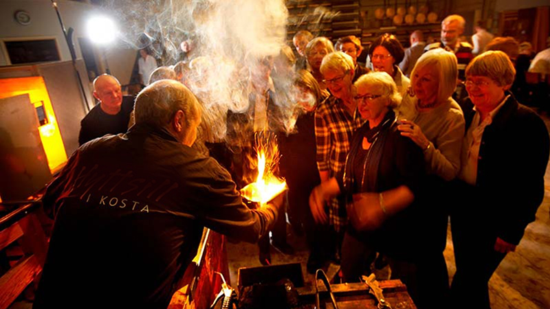 Mitt i hjärtat av Småland ligger Kosta, en plats där glasets magi och tradition möts i sprakande eld och hantverksskicklighet. Här har Kosta glasbruk förvandlat glasmassa till konst i över 280 år – ett av Sveriges äldsta och mest anrika glasbruk. I denna unika miljö upplever vi glasblåsning och den småländska traditionen med hyttsill. – en varm, gemytlig kväll med sill, isterband, kroppkakor och glasblåsning, ackompanjerad av musik och berättelser. Det är en kväll som andas historia, värme och genuin glädje.