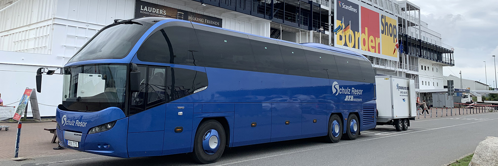 Avresa från Hovslätt på morgonen och efter några timmar når vi Helsingborg och färjar över till Helsingör. Snabba motorvägar i Danmark gör att vi snart är framme vid Rödby och färjar över till Puttgarden. Vi kör non stop hela vägen och pauser blir det på färjorna Ombord på bussen kan ni handla kaffe, dryck, korv mm av vår bussvärd Väl framme i Bordershop är det dags för shopping
